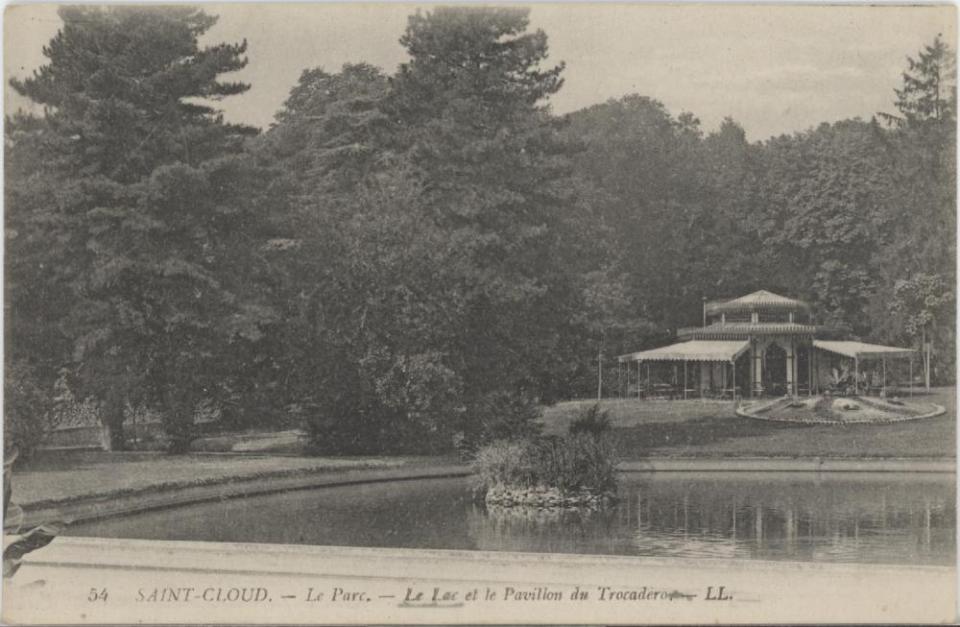 Postcard 4 of 5, October 14, 1918, front view, captioned "SAINT-CLOUD, Le Parc, – Le Lac et le Pavillon du Trocadéro. – LL."