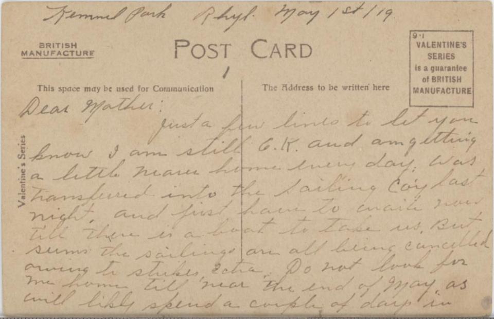 Postcard 1 of 3, May 1, 1919, back view; for transcription see letter entry of same date.
