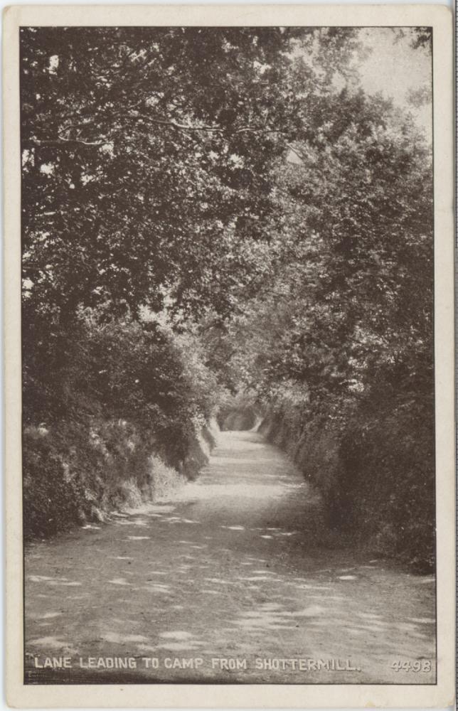 Postcard 5 of 5, date unknown, front view, captioned "LANE LEADING TO CAMP FROM SHOTTERMILL. 4498"